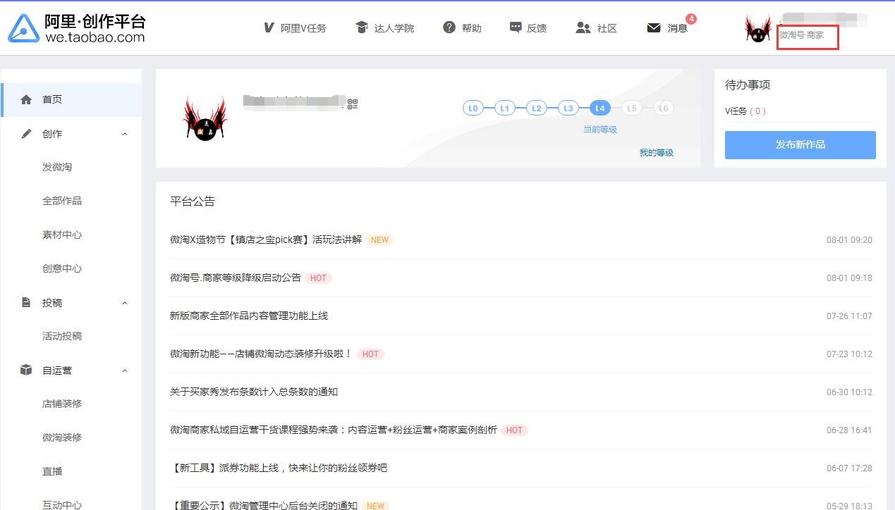 右上角会提示,你是微淘号-商家,需要开通微淘号-达人,才能进行双身份的切换,进入账号设置里面,没有开通的话,这里会显示未开通,需要点击去开通,已经开通过,可以直接切换到微淘号达人界面。